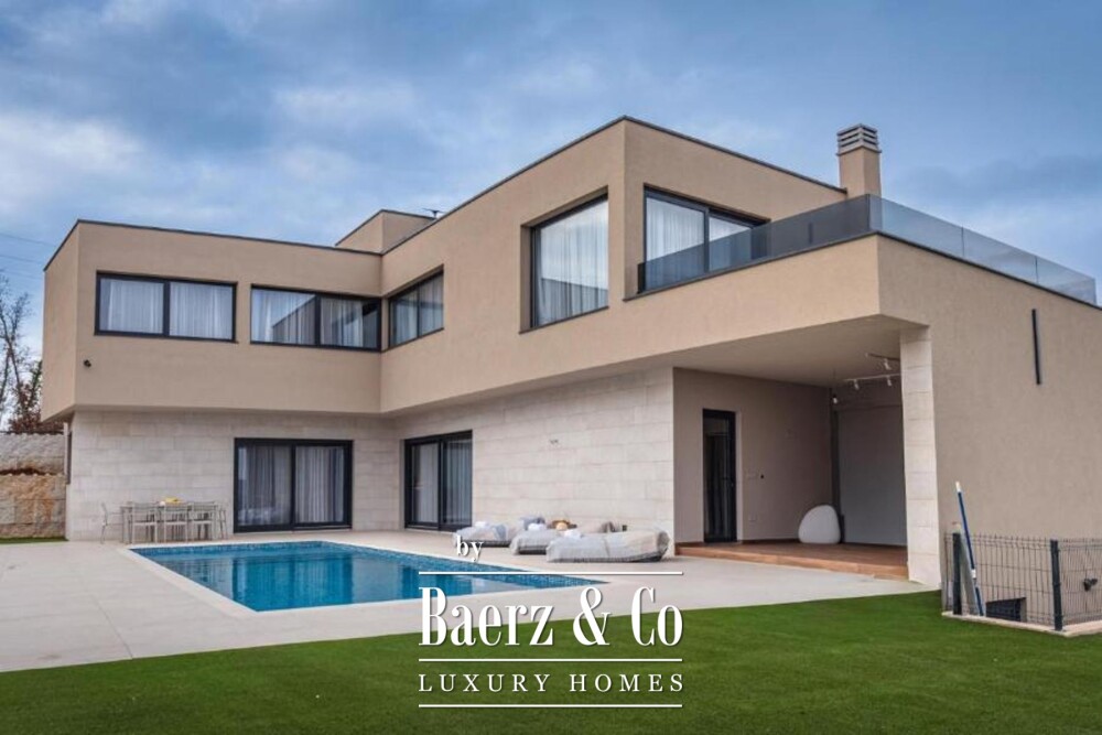 La villa de lujo Tinjan ofrece una combinación excepcional de privacidad, elegancia y amplias vistas en el corazón de Istria central. Esta vivienda contemporánea se ubica en una parcela ajardinada de 781 m², donde sus amplios ventanales inundan los 370 m² de espacios habitables de luz natural y enmarcan impresionantes panorámicas del monte Učka, integrando la belleza exterior con el interior del hogar.