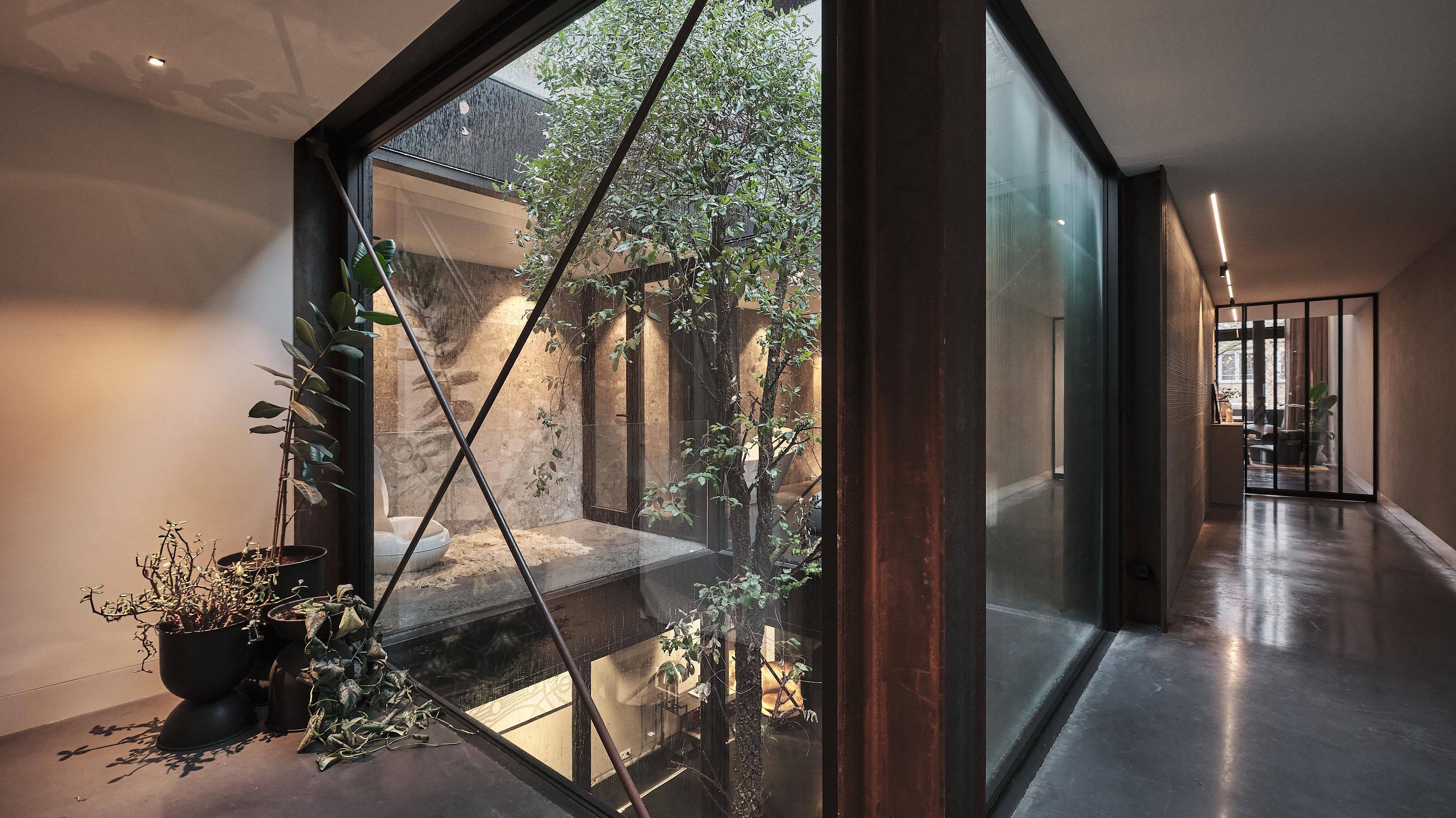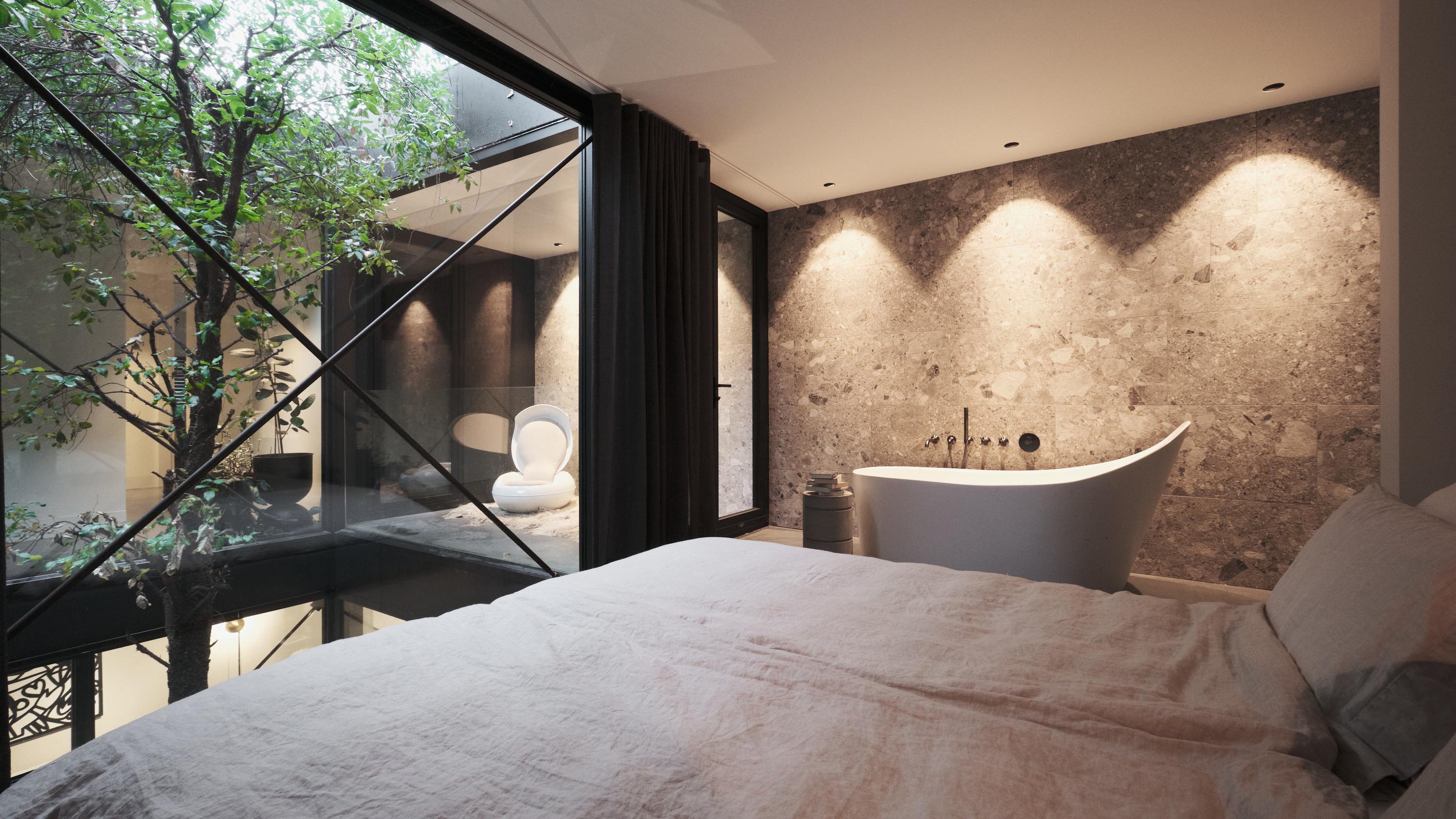 El apartamento se sitúa en Cedron 12 y dispone de tres dormitorios, dos baños y una amplia cocina-comedor conectada por una escalera a un luminoso salón en la planta superior. Las puertas francesas dan acceso a una gran terraza en la azotea parcialmente cubierta, mientras que las visuales interiores cultivan calma y un profundo sentido de pertenencia. Es única la posibilidad de adquirir un espacio de presentación o comercial de 265 m² en Nieuwstraat 48, diseñado para colecciones privadas, trabajos creativos o actividades de ocio. Cada ámbito—vivienda y trabajo—opera de forma independiente aunque comparte la singular atención de Zeelen a la composición, los materiales y la atmósfera.