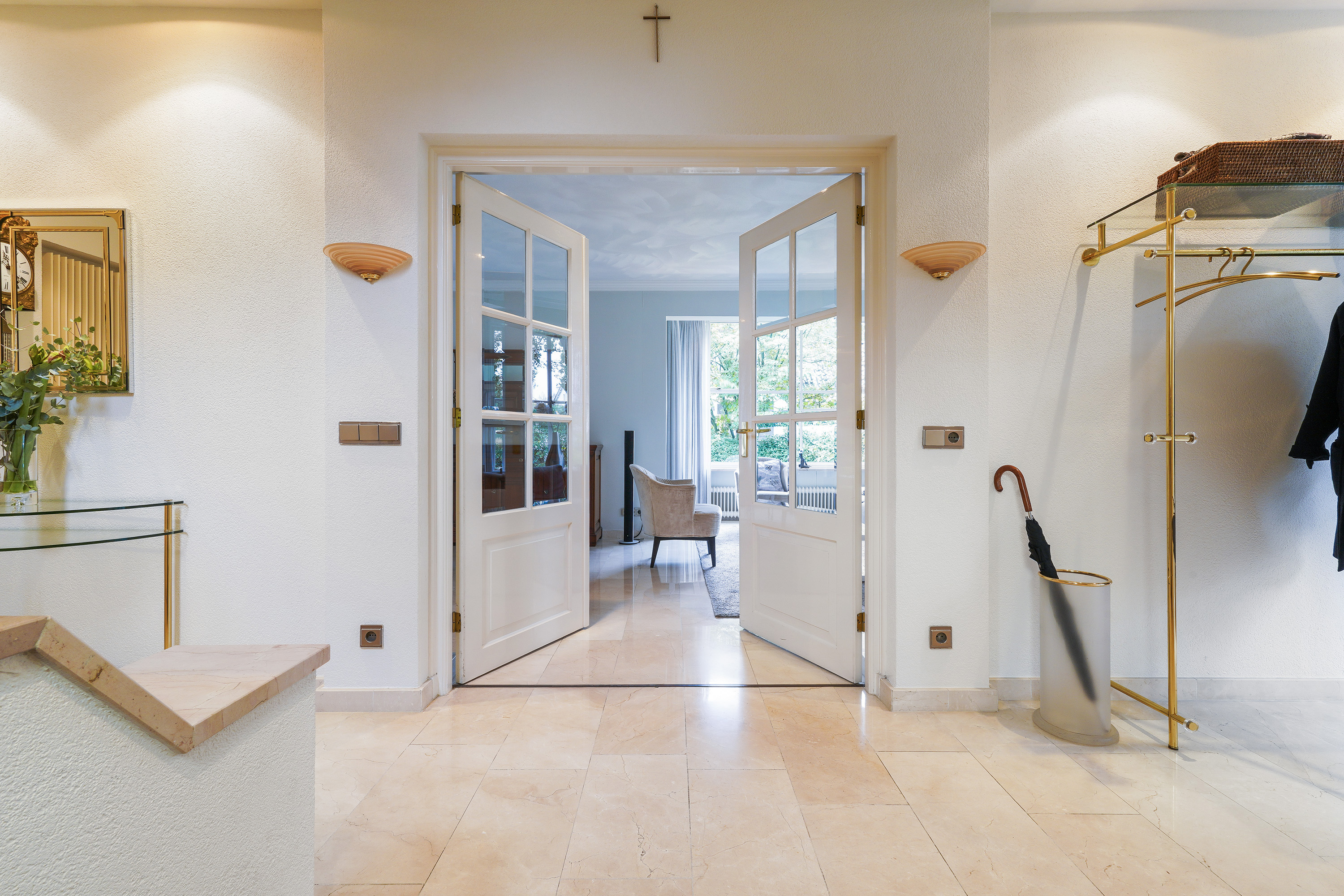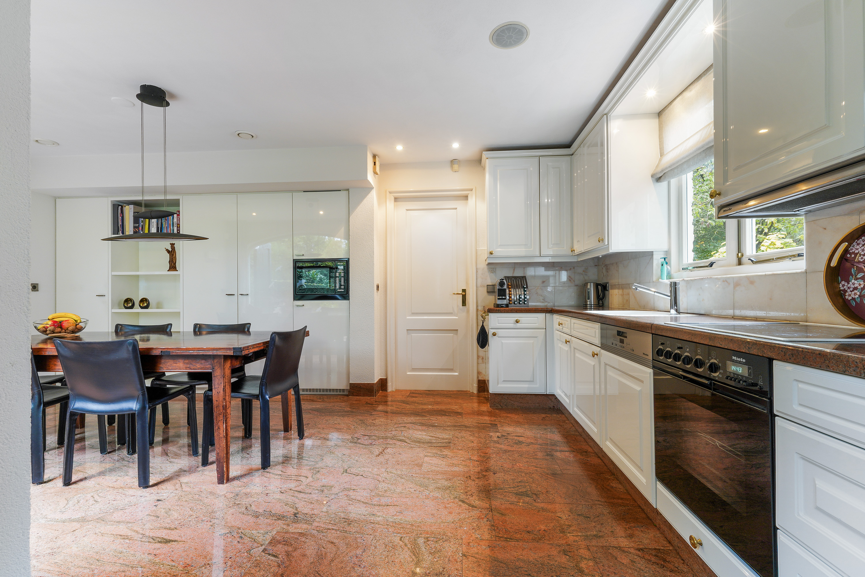 Al entrar, la disposición espacial transmite de inmediato una sensación de luz y amplitud. Una planta baja de aproximadamente 70 m² fluye sin esfuerzo desde la sala de estar al comedor y la cocina de planta abierta, todo inundado de luz natural a través de amplias ventanas. Los materiales como el suelo de travertino y las paredes en tonos claros marcan una estética elegante y serena. La cocina está completamente equipada, con encimera de piedra natural y electrodomésticos integrados; también hay un lavadero práctico y un área de almacenamiento de 17 m² que resuelven las necesidades cotidianas con eficiencia y discreción. Espacios adicionales de almacenamiento y una bodega ofrecen mayor versatilidad, ya sea para provisiones o para una colección de vinos.