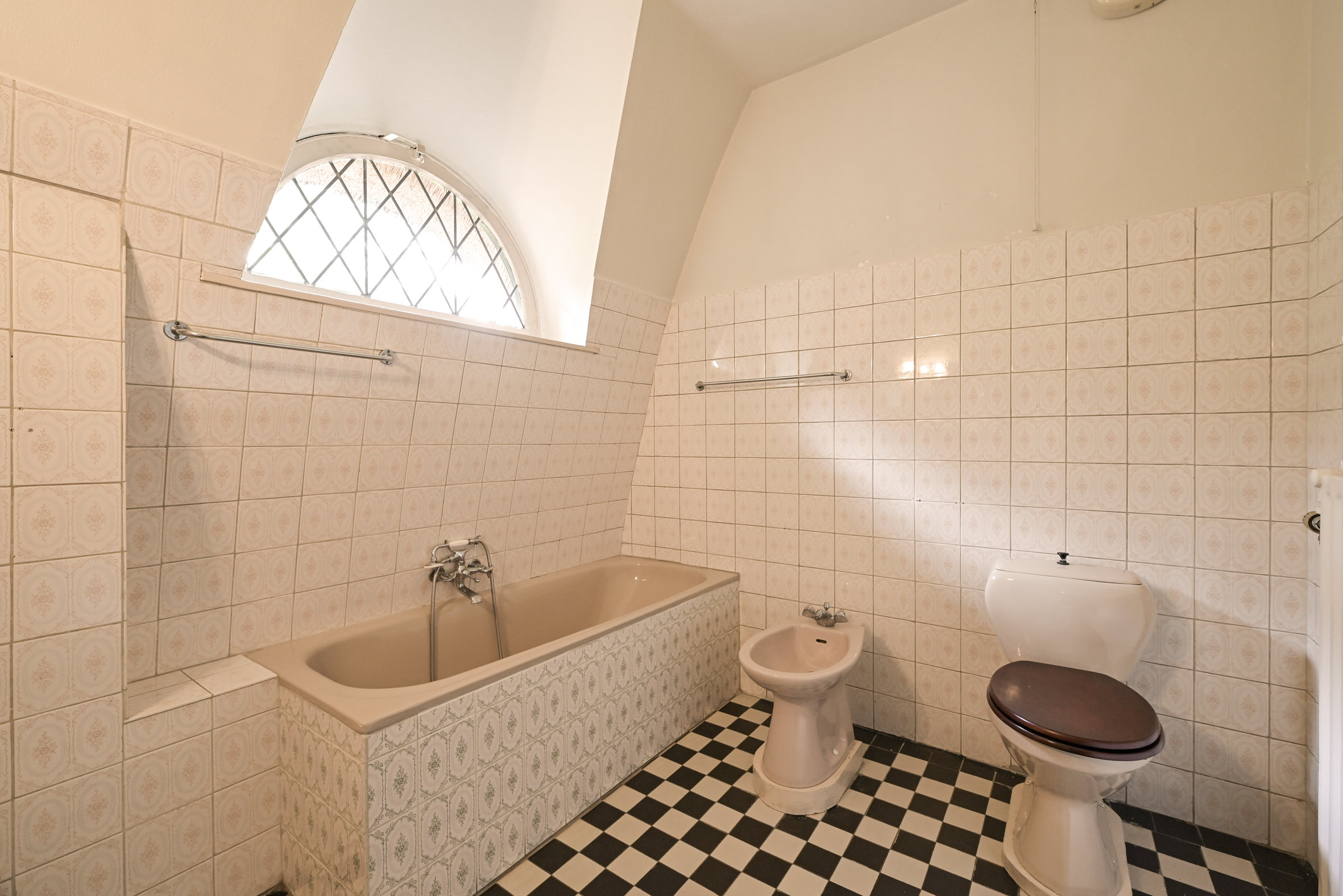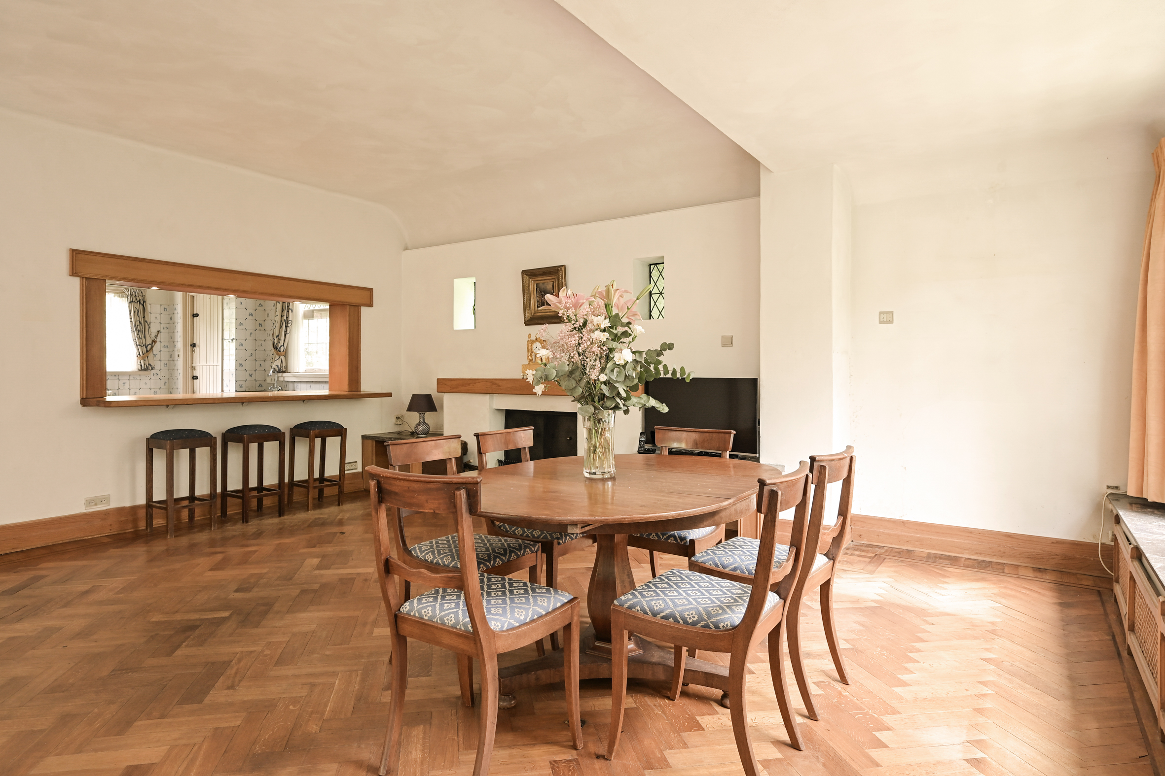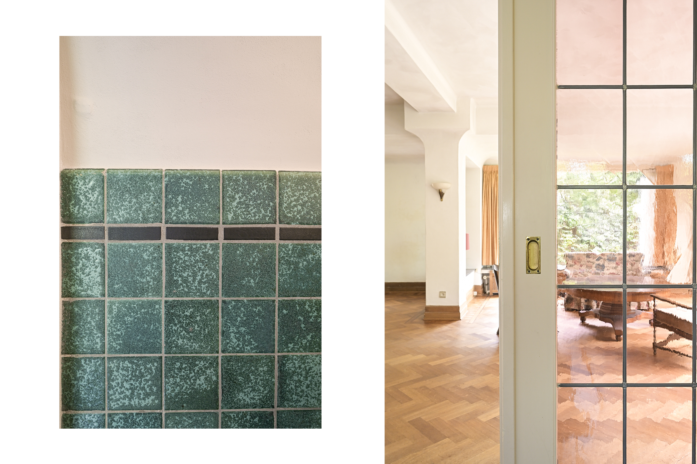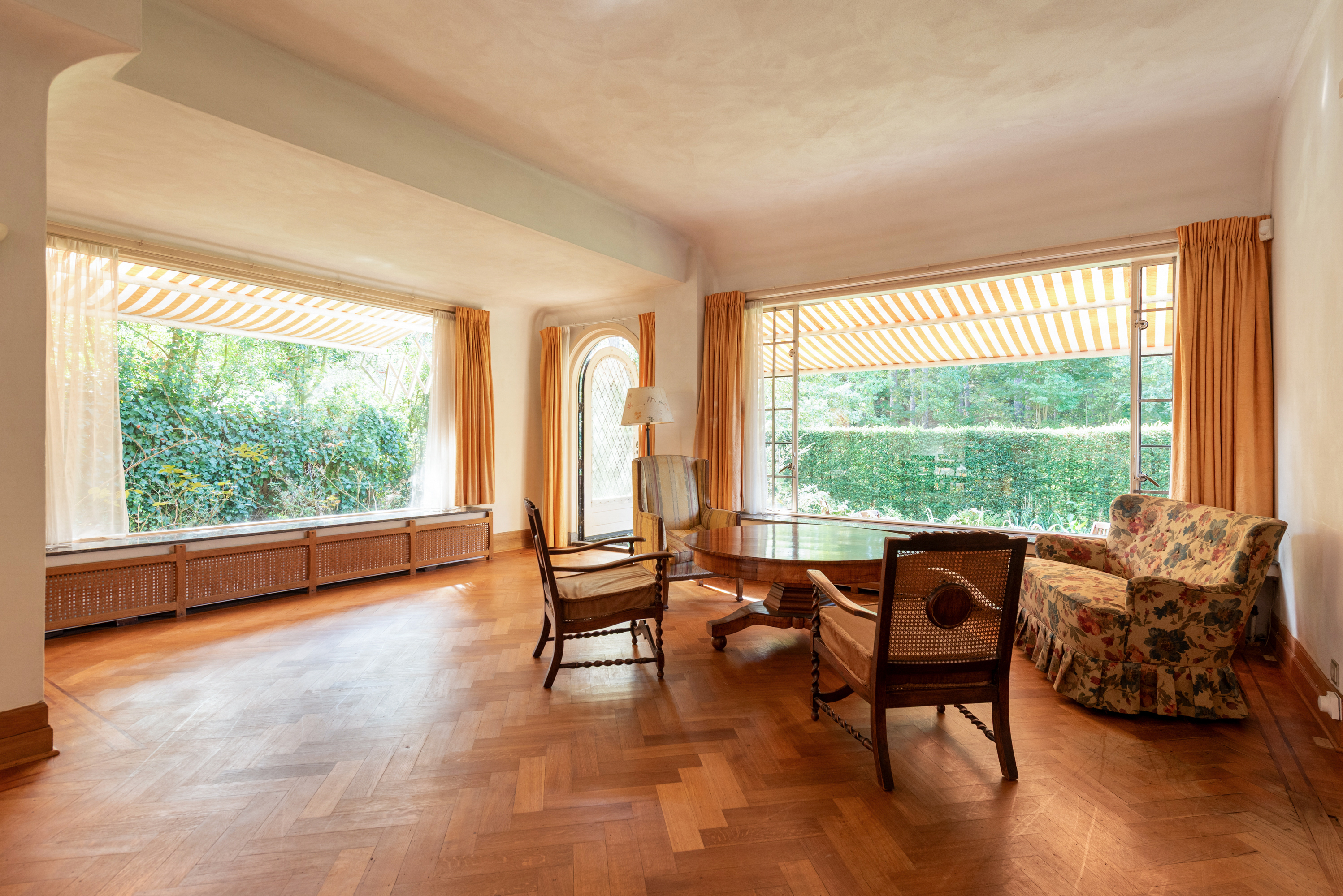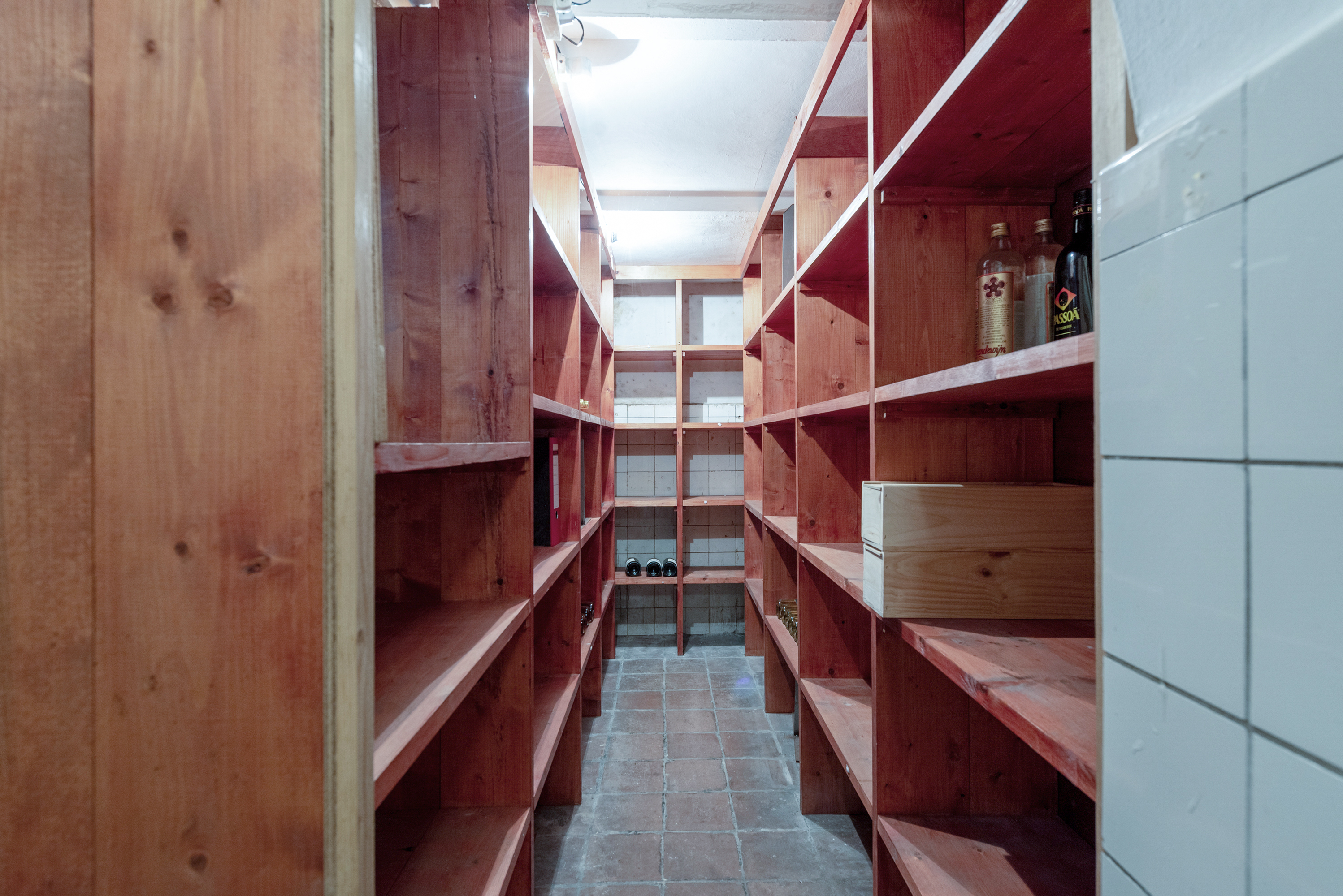 Un espacioso vestíbulo, con suelos de mosaico, te da la bienvenida y conduce a una elegante sala de estar y comedor con puertas correderas de vidrieras, chimenea y alféizares de mármol. Esta estancia, de concepto abierto, conecta directamente con el jardín y deja entrar la luz natural y el ambiente exterior. La cocina, organizada en formato semiabierto y con acceso directo al jardín, comunica con una práctica sala de lavandería y una bodega de 23 m² dividida en tres estancias.