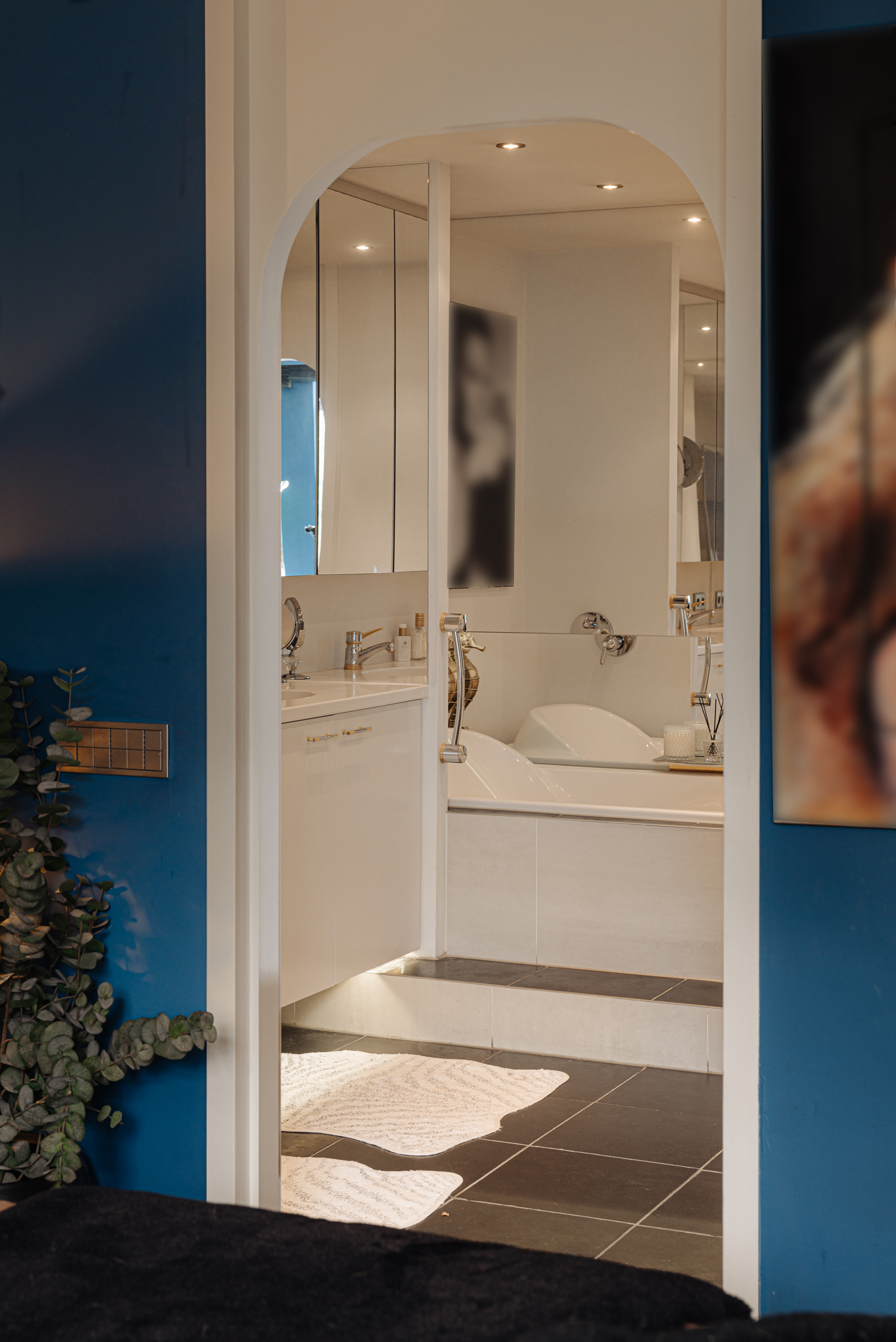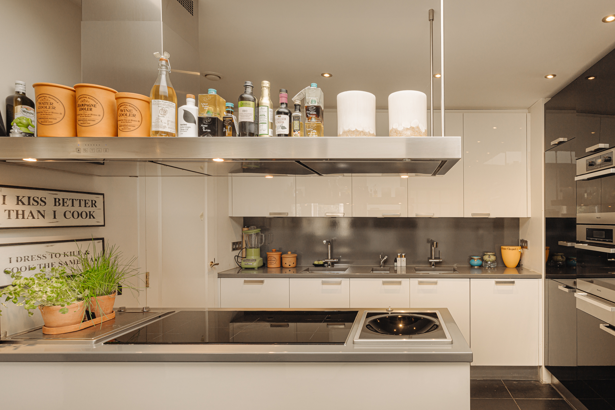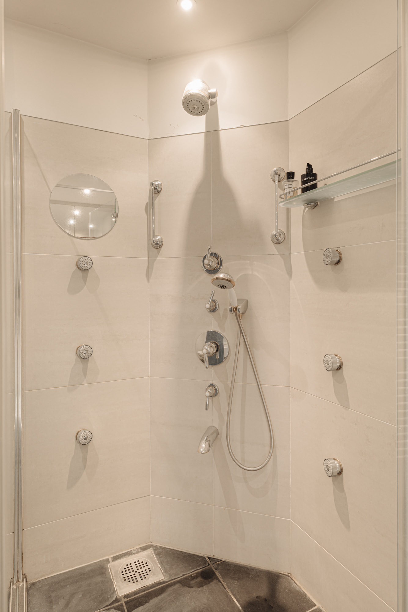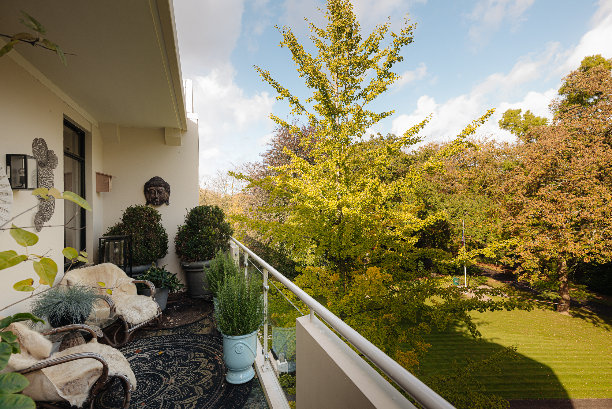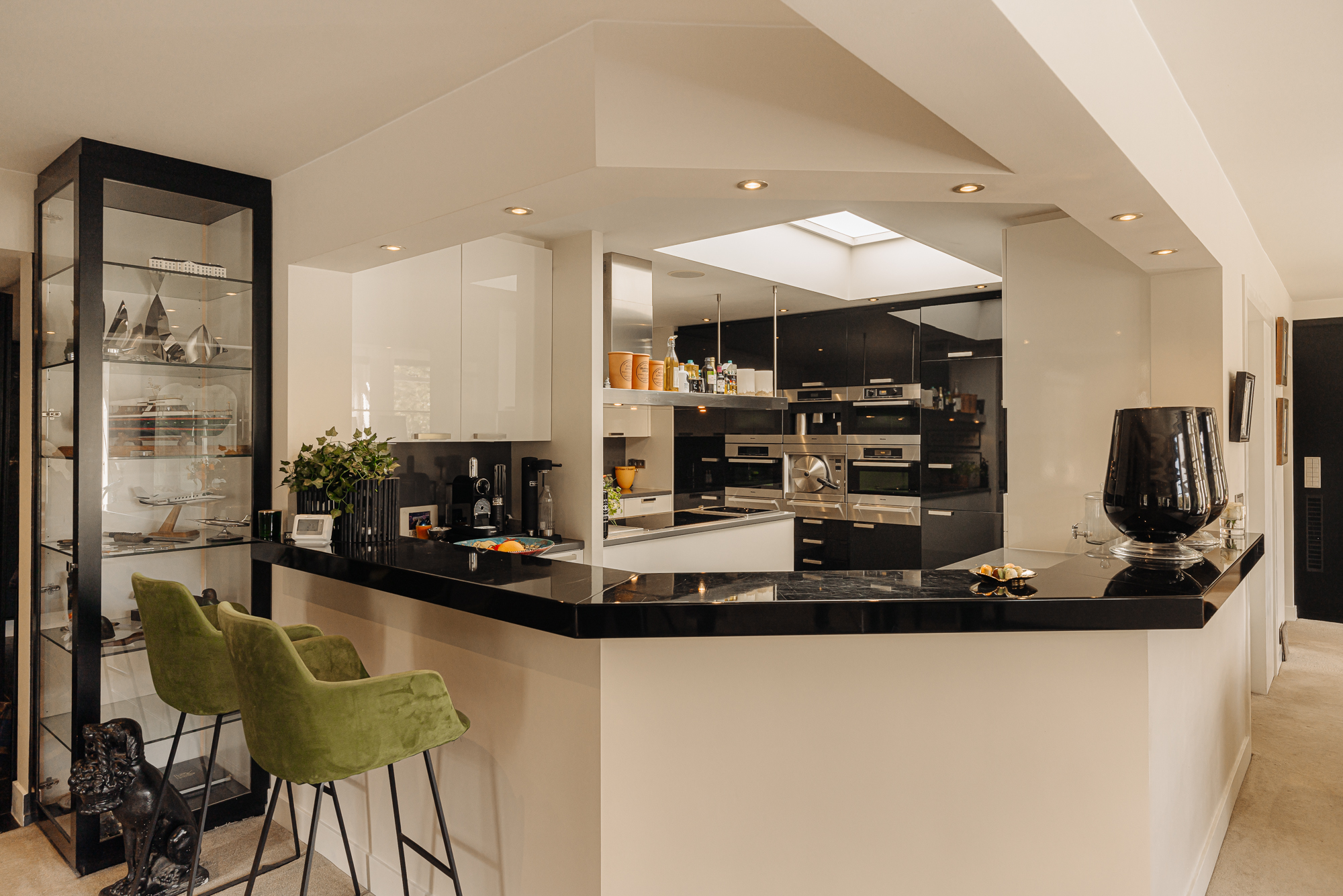 La distribución recibe con una entrada central y ascensor, que conducen a un vestíbulo con calefacción por suelo radiante. La suite principal está estratégicamente situada en la parte trasera, con baño privado equipado con ducha de vapor, amplia bañera y doble lavabo. Otras estancias incluyen un dormitorio de invitados con baño privado y una oficina revestida en nogal. Puertas acristaladas llenan de luz suave el área de estar, expandiéndose hacia dos balcones con vistas al maduro entorno ajardinado y a delicados elementos acuáticos. La cocina semiabierta, equipada con electrodomésticos Miele y vinotecas, es el eje de la vida diaria y de las reuniones pausadas.